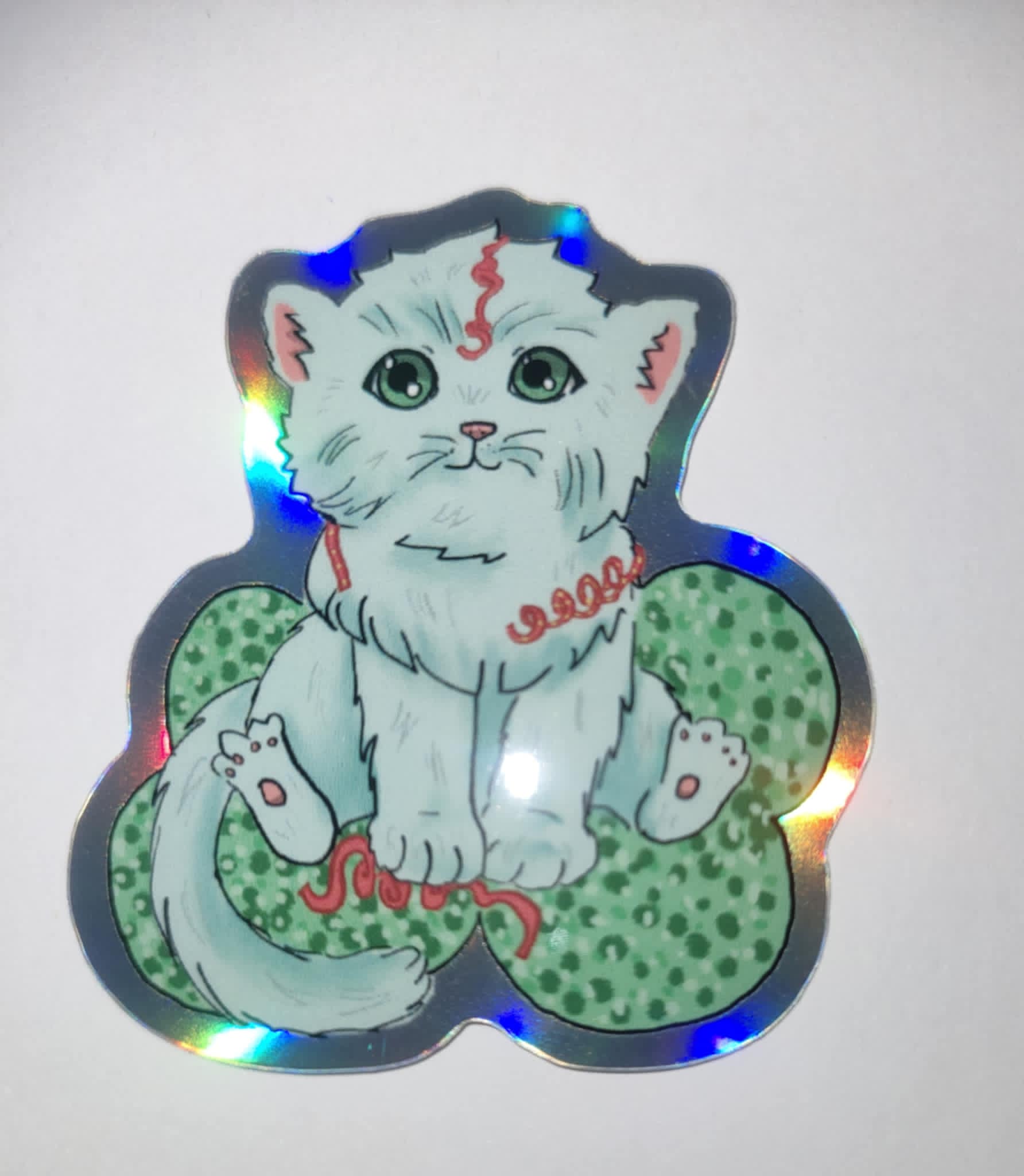 Feiere den Jahreswechsel mit Stil: Der hochwertige Holo-Sticker „Silvester-Katze“ zeigt eine weiße Angora-Katze mit Luftschlangen, sitzend auf einem Glücksklee. Der schimmernde Hologramm-Effekt sorgt für besondere Lichtreflexe und macht den Sticker zu einem echten Blickfang – ideal für Silvester, Neujahr und festliche Dekorationen.